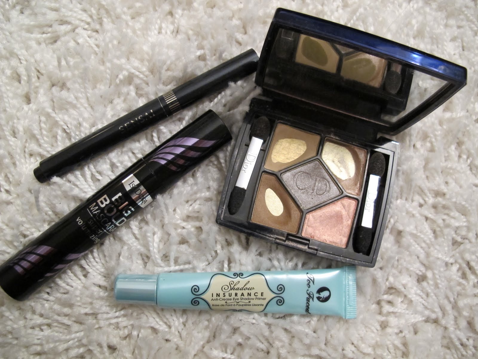 Silmämeikki on helppo. Pohjustus Too Facedin Shadow Insurancella, silmämeikki itsekootulla Diorin viisikolla, rajaukset Sensain ruskealla nestemäisellä linerilla ja mascaraksi Isadoran Big Bold Mascaraa.