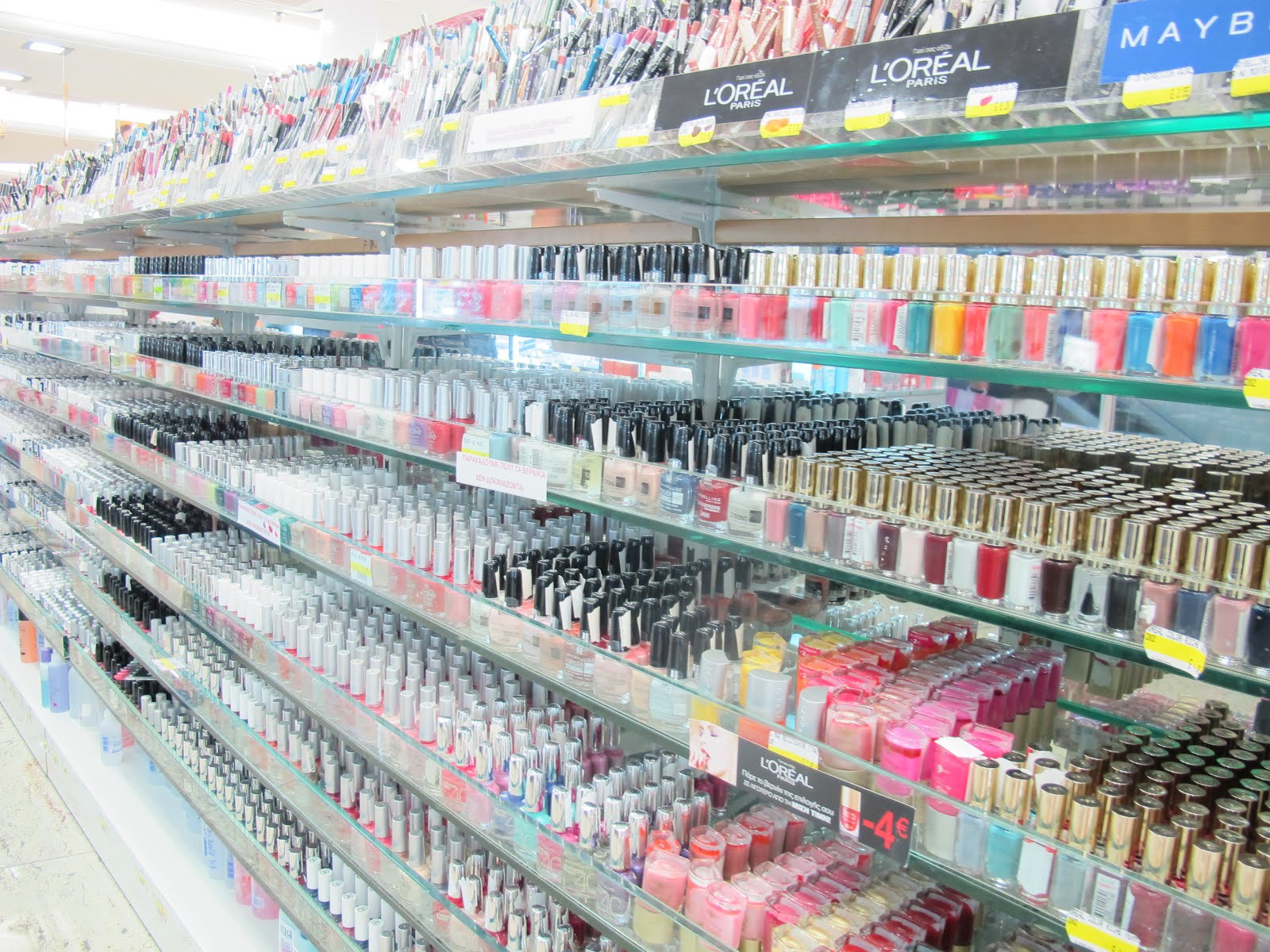 Tässä oli vaan yksi pitkä hyllyllinen kynsilakkoja ja meikkikyniä! Tila ei ollut loppujen lopuksi mikään ihan mielettömän suuri, mutta tarjolla oli vaikka mitä kosmetiikkamerkkejä ja hius- ja vartalonhoitopuolella tuotteista vasta olikin tyrkyllä. Ja siis ennen kaikkea kaikkea erityistä ja halpaa! En kuitenkaan ostanut yhtään mitään.