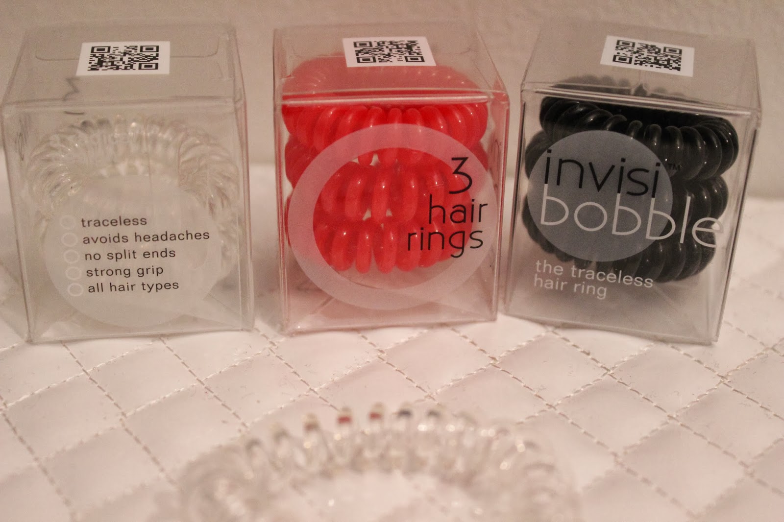 Näiden lenksujen idea kun perustuu juuri nimenomaan siihen, että ne ovat hiuksille hellävaraisia ja painaumia jättämättömiä. Kierteinen ja venyvä lenksu nappaa hiuksiin tukevasti kiinni ja pitää hiukset napakasti paikoillaan ilman, että sitä täytyisi kiristellä häiritsevän tiukalle. Minusta nämä ovat aivan loistava keksintö!
