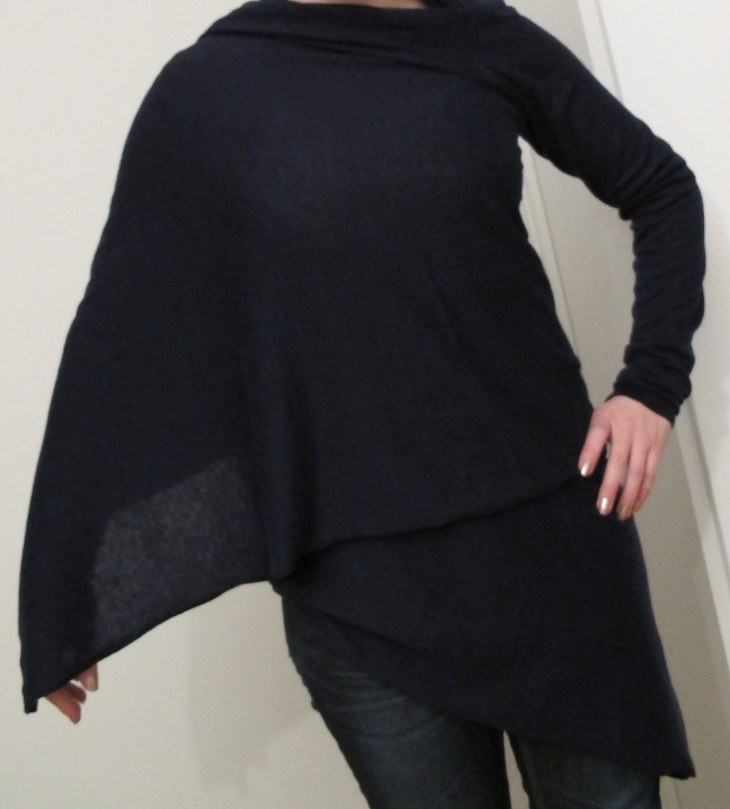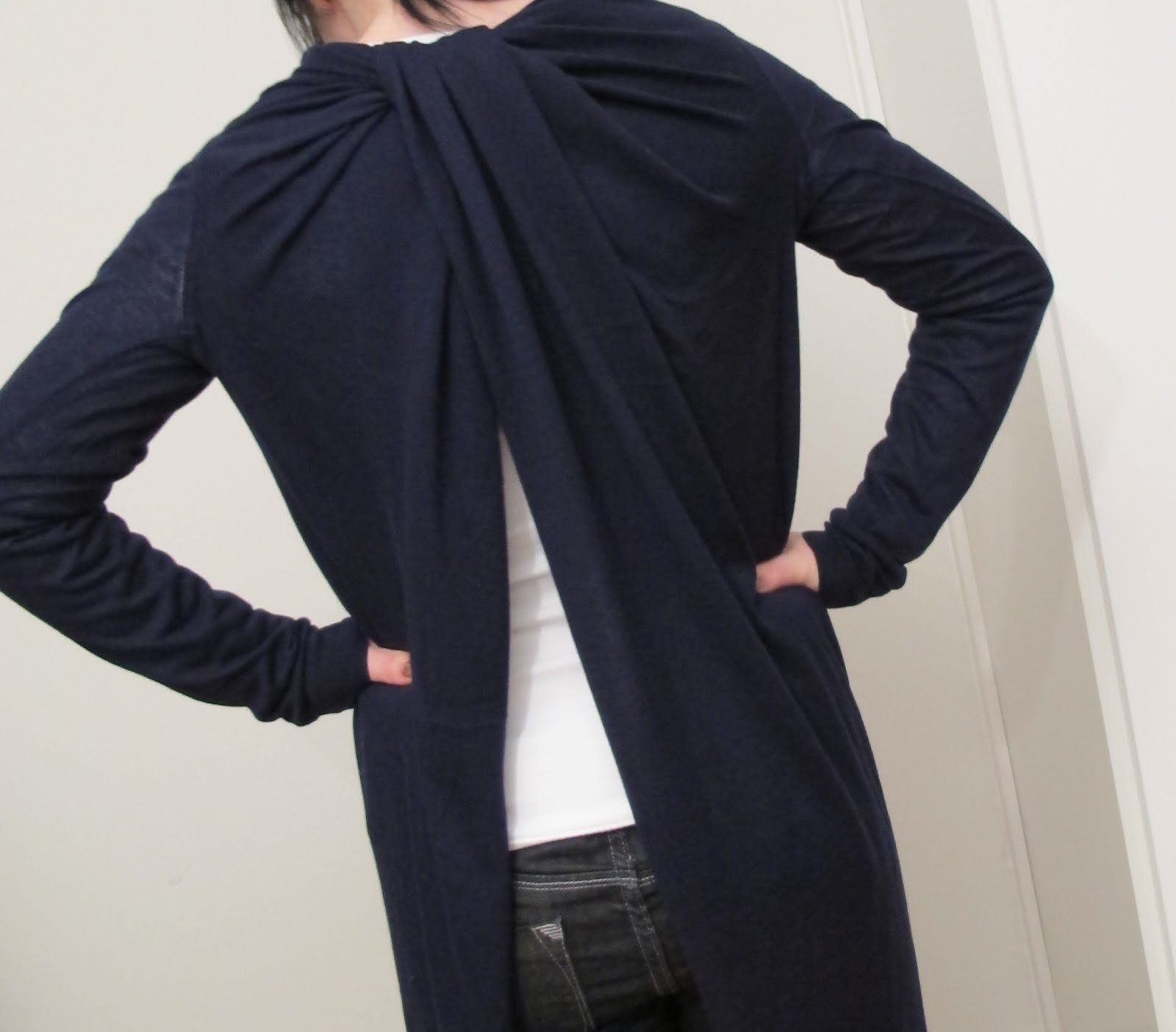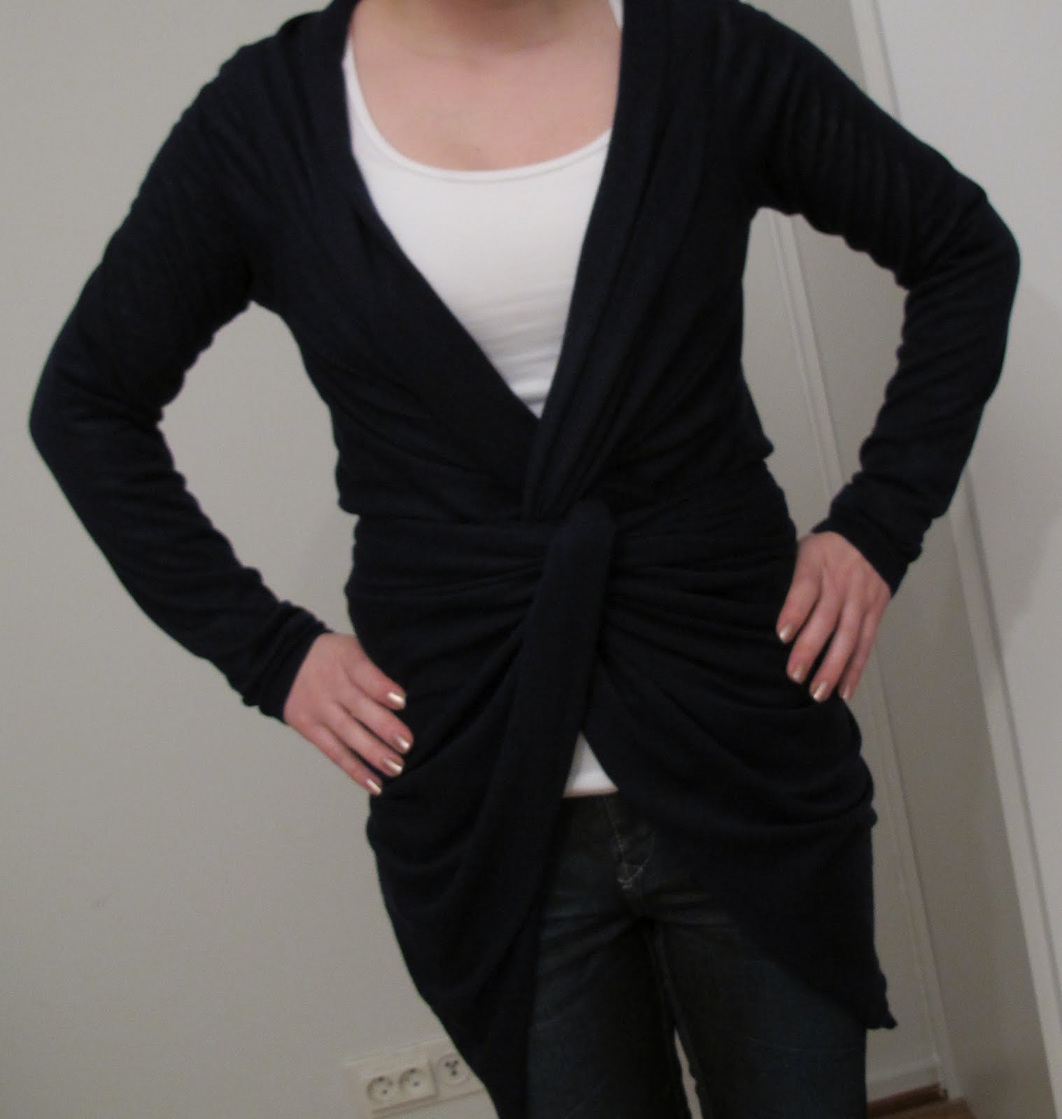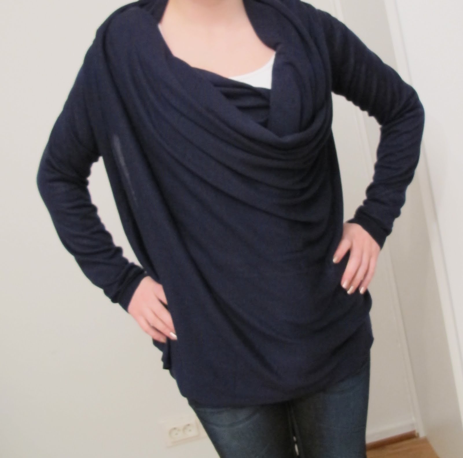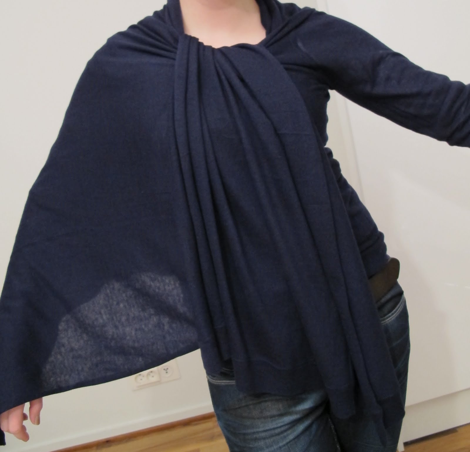 Koska olen itse melkoinen pätkä (155 cm), on avonainen Cozy minulle hieman liian pitkä. Siksi laitan sen molemmista puolista yhden nurkan keskenään solmuun ja nostan solmun niskan taakse, jolloin Cozy on hieman edellistä lyhyempi neuletakki.