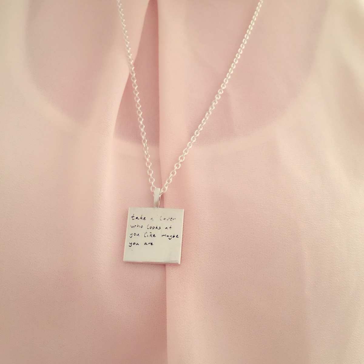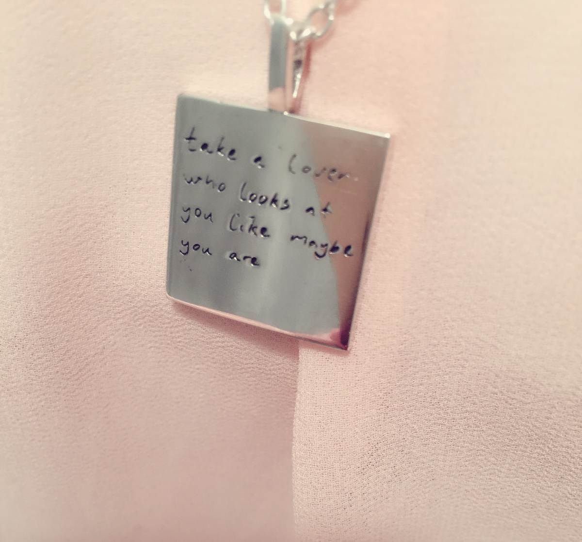 Se, että koruun on kaiverrettu juuri hänen hänen omalla käsialallaan hänen minulle kirjoittamansa lause tekee korusta niin henkilökohtaisen kuin se vaan voi olla. (Vaikkei kaiverruksessa näkyvä osa olekaan se uniikki lausahdus…)