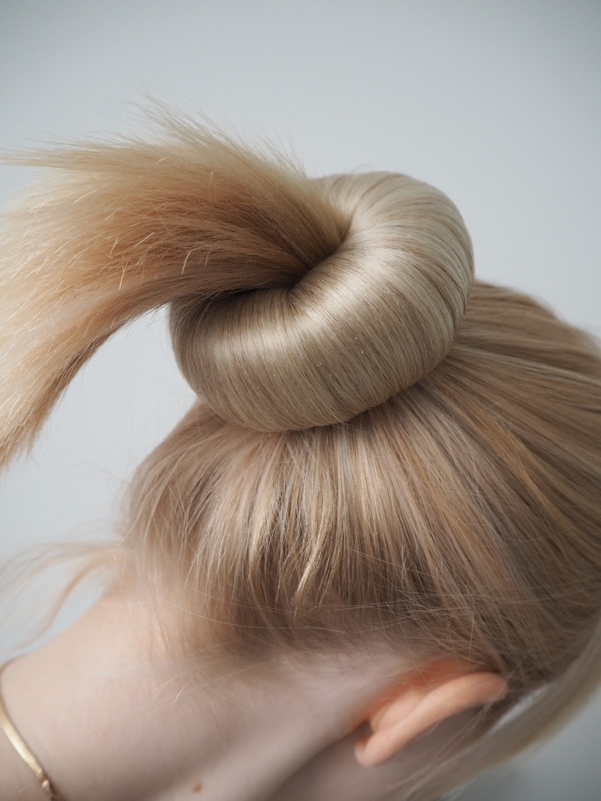 Tämän jälkeen avuksi otetaan donitsin muotoinen hiusvalkki. Näitä on saatavilla eri värisinä (vaalea, ruskea, musta) ja eri kokoisina ja pitkissä hiuksissani ne olivat mitä kätevin ja nopein tapa tehdä nuttura, kun asetin donitsin ponnarilla olevien hiusten latvoihin ja lähdin vaan rullaamaan hiuksia sen ympärille kuten sukkanutturassa ilman, että hommaan tarvitsisi edes pinnejä. Lyhyessä tukassa hiusmassaa ei kuitenkaan riitä valkin ympärille samalla lailla, joten mitä parhain apu tulee hiusvalkista, jossa on jo valmiiksi hiuksia rullattuna ympärille. Näitä löytyy perushiusväreissä (omani on Glitteristä, muistaakseni noin 8 euroa) eikä tämän kanssa tarvitse pelätä, että valkki vilkkuisi hiusten seasta.