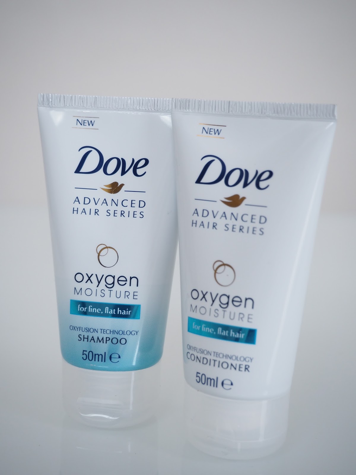 Olen katsellut näitä paljon katumainoksissakin näkynetä Doven uusia Oxygen Moisture -tuotteita kaupassa jo aiemmin sillä silmällä, joten oli mukavaa, että boksin mukana tuli tällainen juuri passelin kokokoinen parivaljakko. Olen aina valmis kokeilemaan, josko markettituotteiden puolelta löytyisi loistavia uusia hiustuotteita!