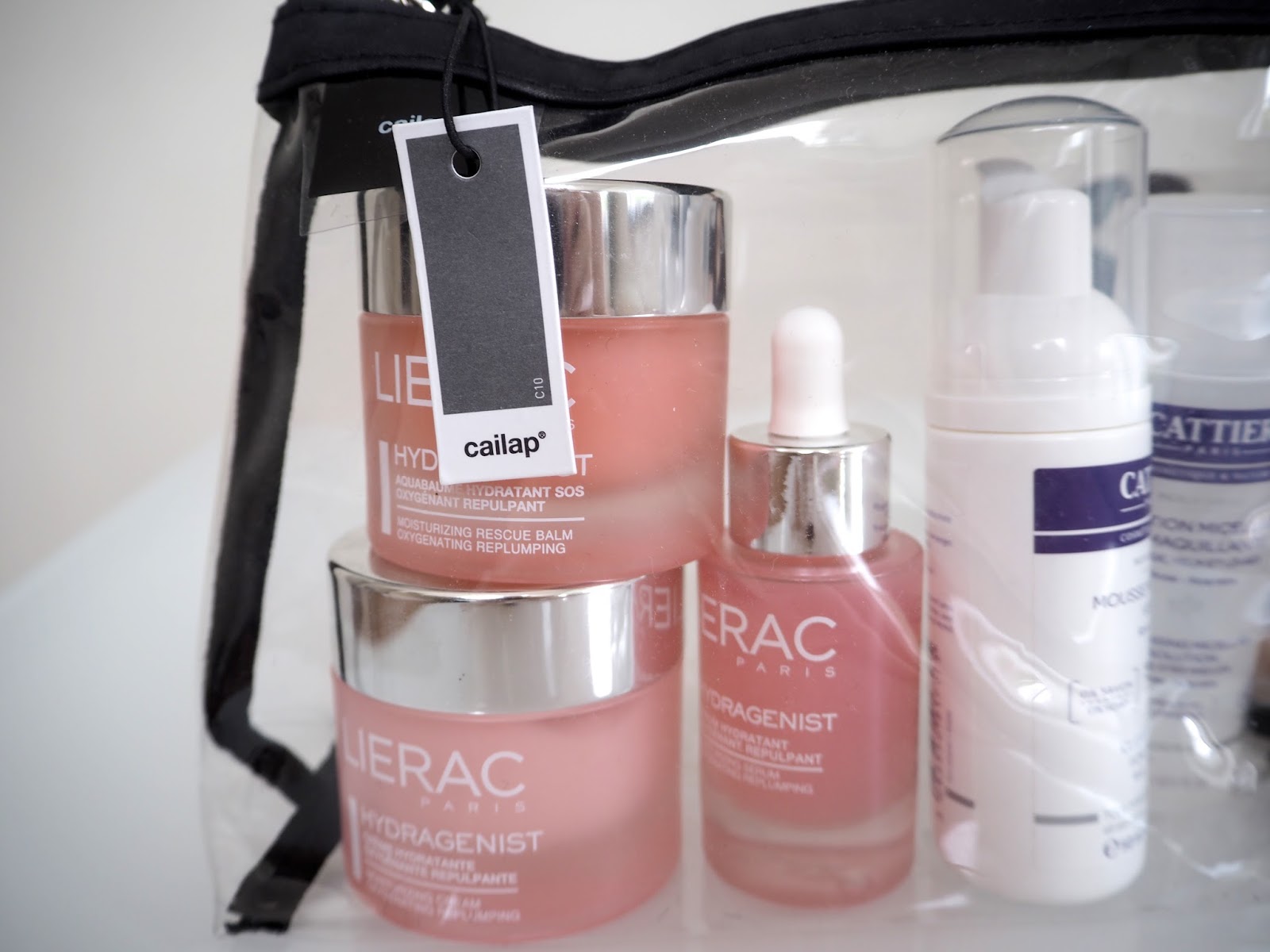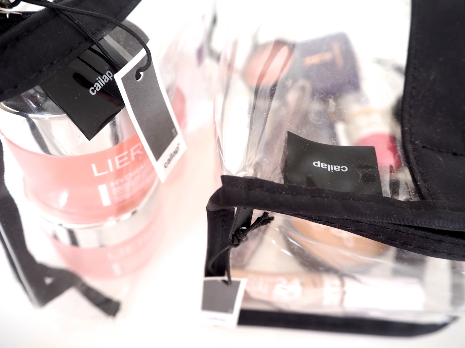 Koska kuitenkin inhoan meikkipussien penkomista olen korvannut ne yleensä ihan vain läpinäkyvillä minigrip-pusseilla tai muilla lentokenttien turvatarkastuksista minulle päätyneillä variaatioilla. Tämän  vuoksi olinkin erityisen tyytyväinen, kun kotimainen Cailap lähetti minulle keväällä pari läpinäkyvää (ja huomattavasti minigrippejä kestävämpää…) meikkipussia.