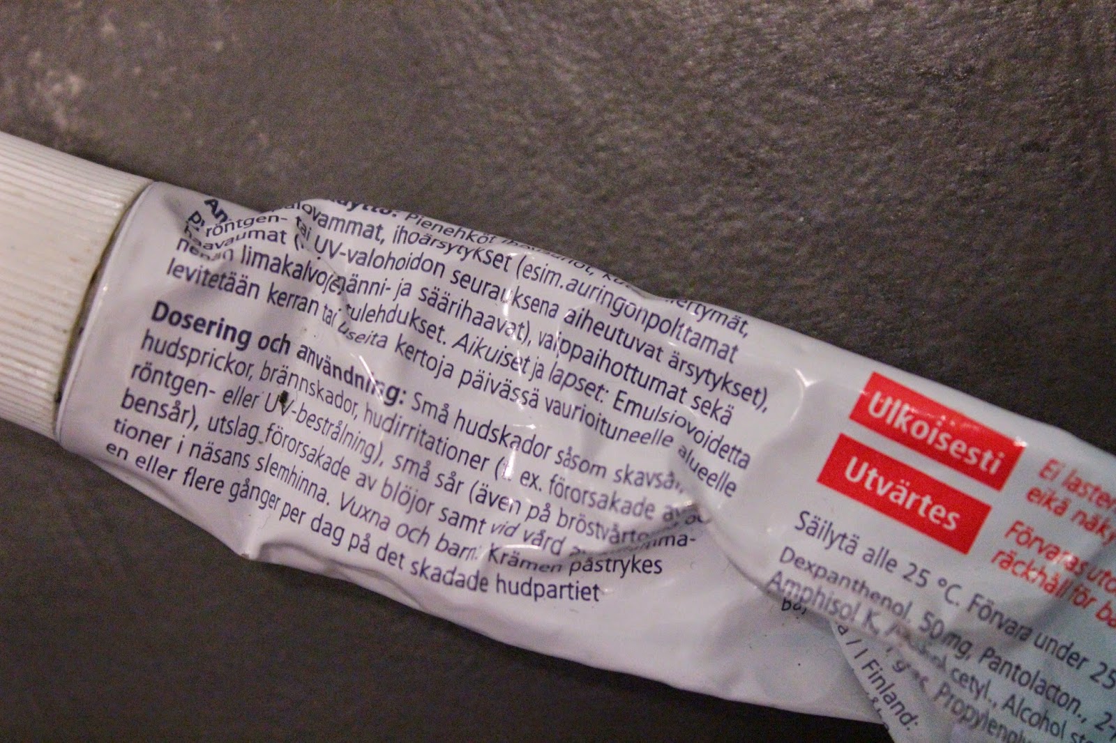 4. Itselläni ei ole tarvetta juurikaan näppyjen korjailuun, kun tulee ehkä yks kuukaudessa jos sitäkään. En myöskään oo kuullut, että tää ihmevoide käy tähänkin hommaan. Sen sijaan käytän sitä vaaleenpunasta kaikennäkösissä haavoissa ja nirhaumissa kynsitikuista lähtien ja tuntuu, että tosiaan yhdessä yössä se parantaa aivan mielettömästi 🙂 Oon yrittäny miehekkeelleni sanoa joka kerta kun se tulee jonkun haavan tai palovamman kanssa töistä kotiin, että laitappa bebantteenia, ni ei koske enää ja aamulla ei ees näy mitään. "Akkojen rasvoja" kuulemma.. Kaksi kesää sitten tuli tuota sinistä hölvättyä kyllä todella pahasti auringon polttamaan ihoon, ja siihen se oli kuin tehty, hyvästi kipu ja poltto.