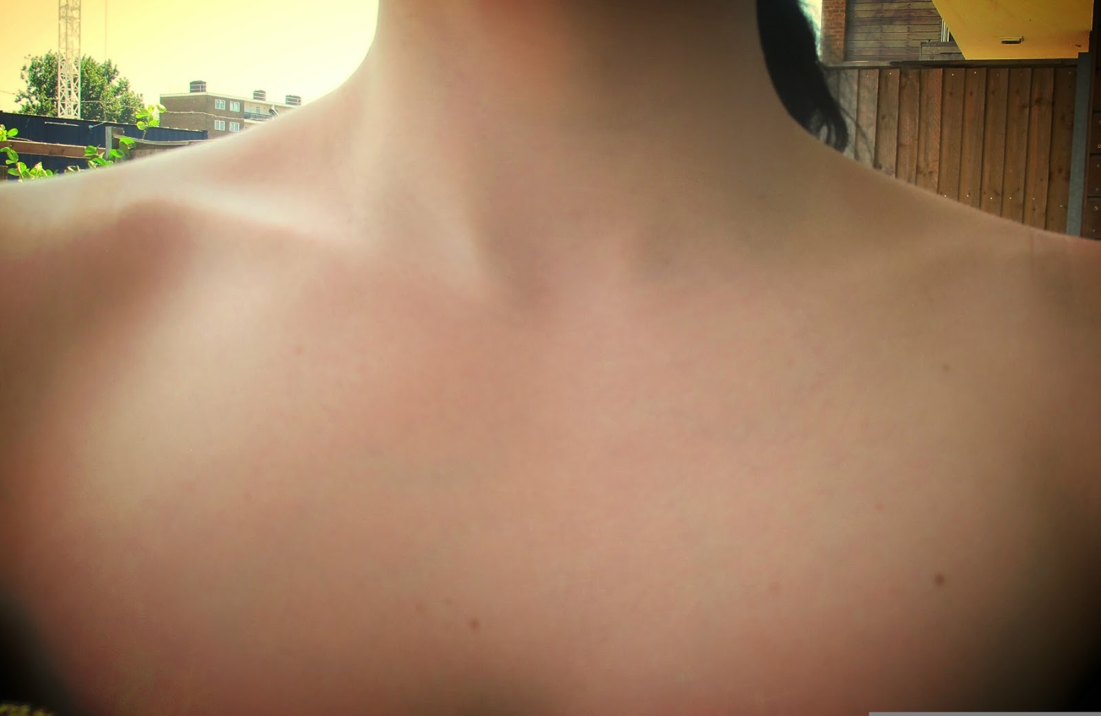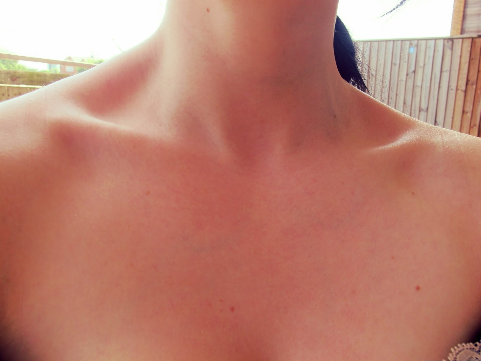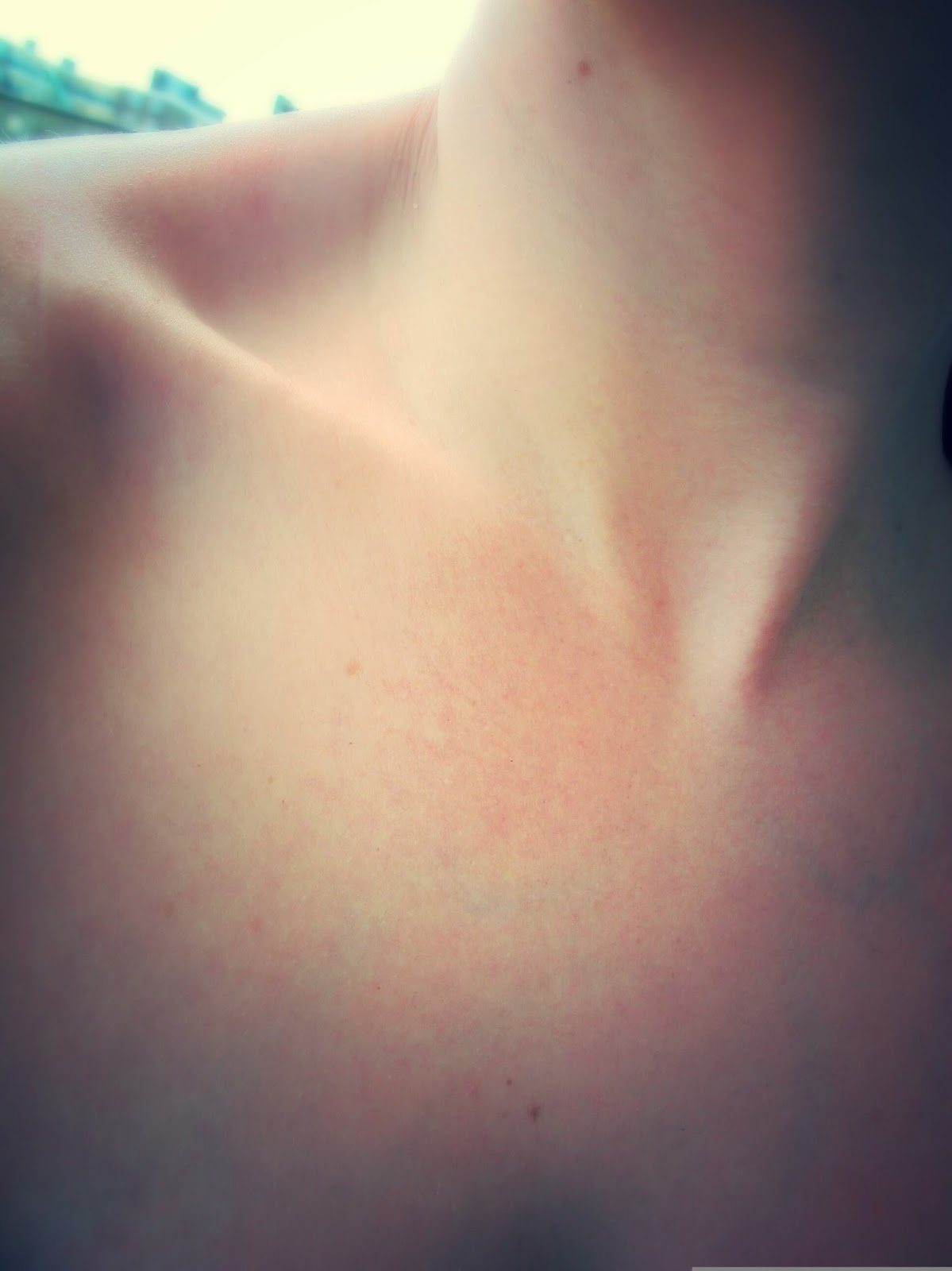 Se on eka alue mulla, joka yleensä saa aurinkoa (naamassa pakkeli suojaa sen verran ja yleensä siihen muistankin hyvin laittaa suojakerrointa), mutta nyt olen kiinnittänyt huomiota dekolteenkin suojaamiseen. Mulla yleensä kun se alue on aika avoinna, niin mulla on ollut mitä ihmeellisemmän näköisiä rajoja siinä 😛