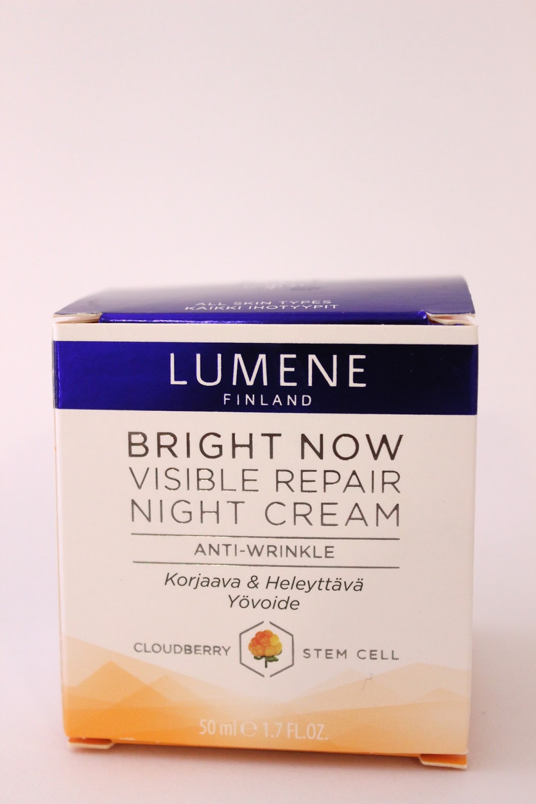 Kaapissani oli jo jonkun aikaa odotellut aktiivista käyttöönottoa Lumenelta joskus blogin kautta saamani Bright Now Visible Repair Night Cream, joka lupaili korjausta ja heleytystä iholle.