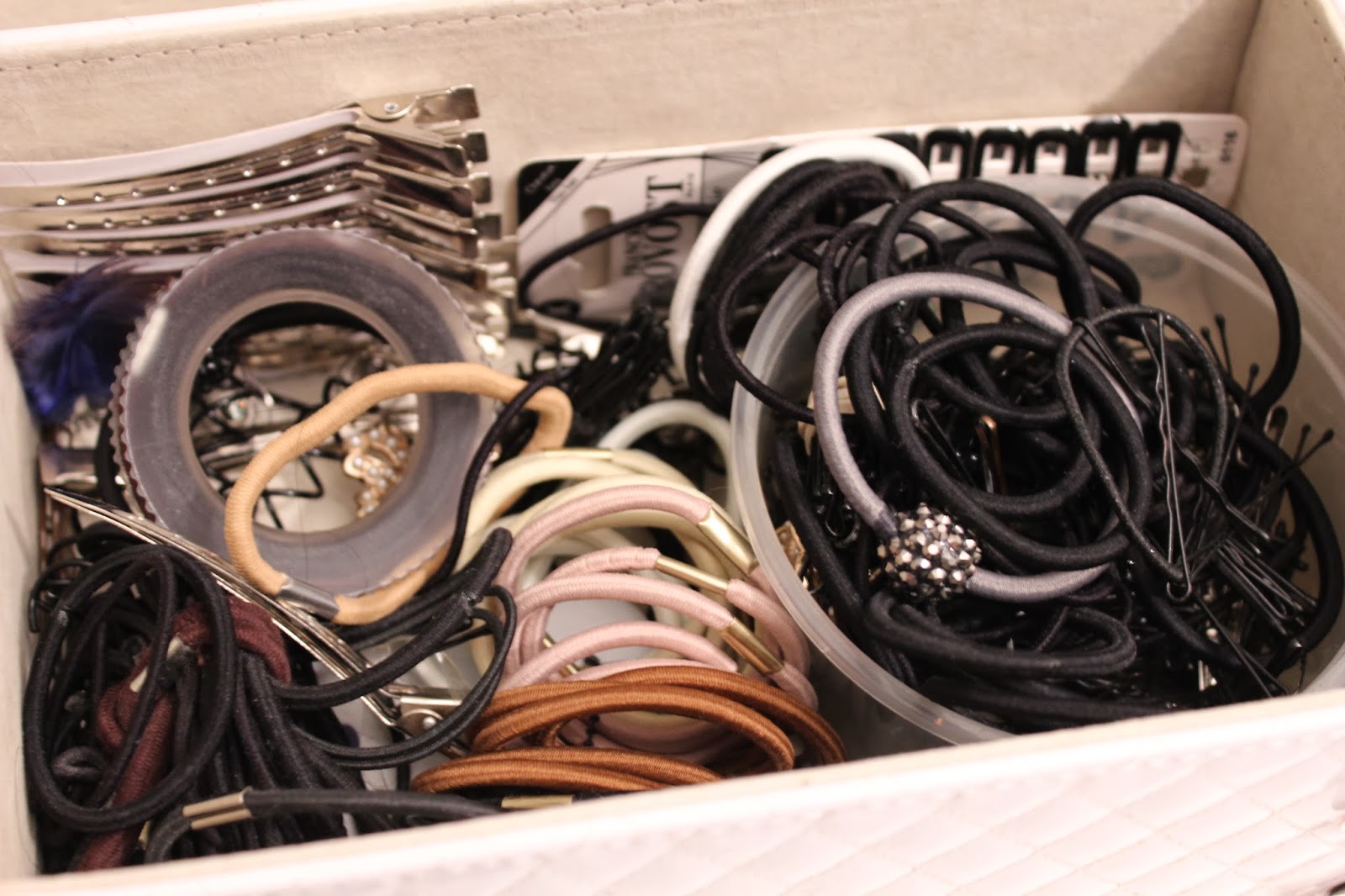 Olen tummahiuksinen enkä oikeastaan koskaan käytä muita kuin tummia ja ruskeita, beigeja ym. ”turvallisen” värisiä ponnareita, joten miksi ihmeessä minulla oli laatikko täynnä niitä kaikissa sateenkaaren väreissä kulta- ja hopeakimalteillakin vielä varustettuina? Oli todellakin aika karsia kaikki turhat pois ja pitäytyä vain niissä, joita yleensä käytin, sillä niitäkin oli jo riittävästi.