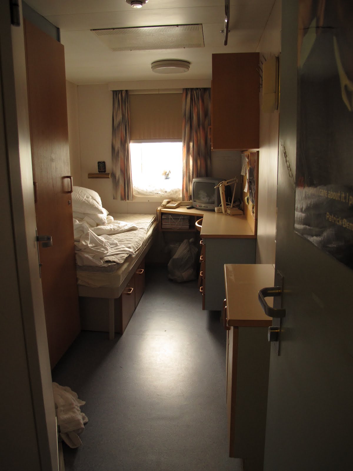 Kun työvuoroni viimeisenä iltanani loppuu ennen puolta yötä, menen hyttiini ja kasaan yleensä tavarani laukkuuni vasta siinä vaiheessa.