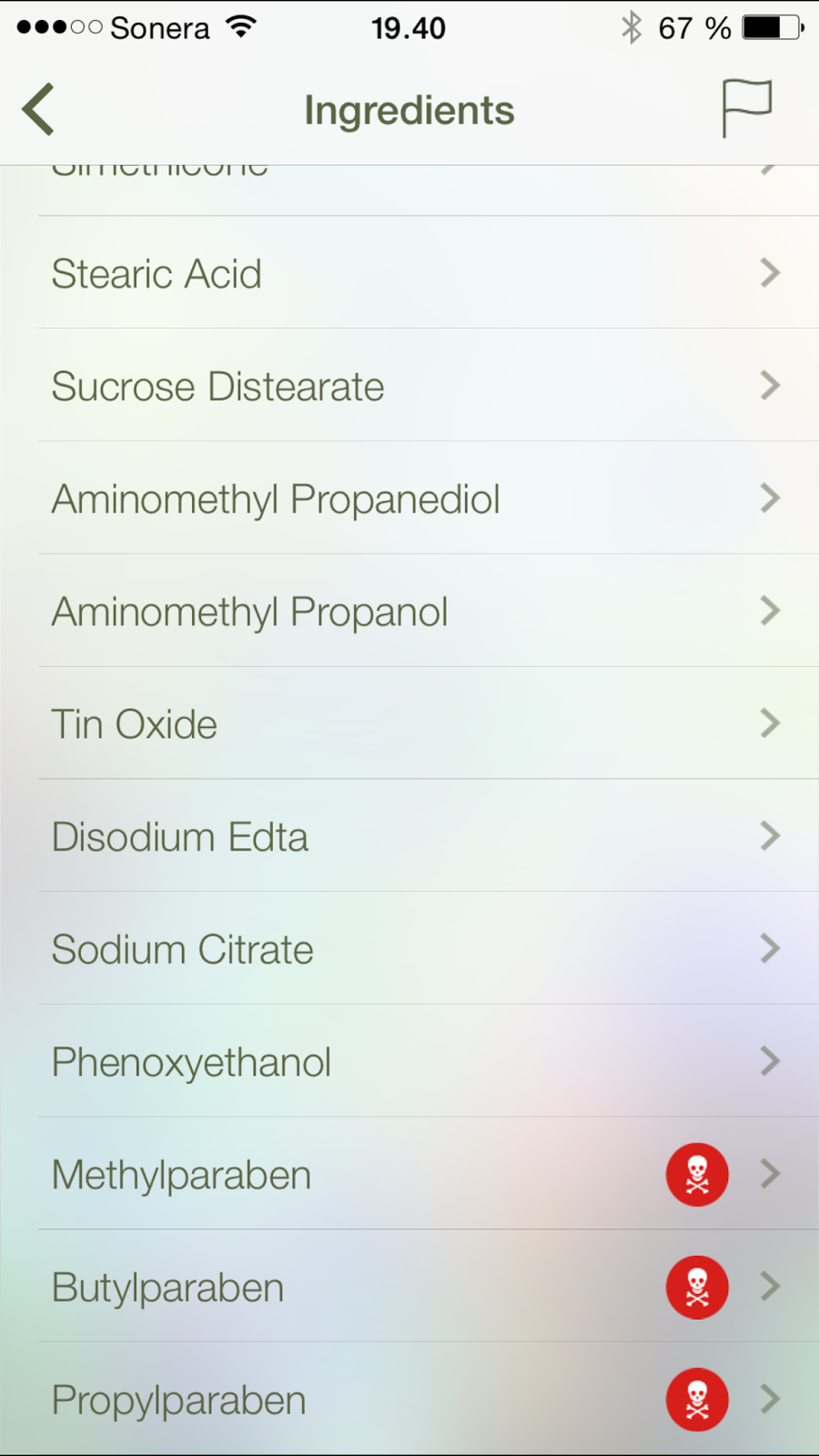 Itse appi on minusta oikein hyvä ja käyttökelpoinen, olen valinnut listalle tietyt ainesosat jotka ärsyttävät ihoani ja niiden välttelyssä appi on ollut hyvä apu. Sovellus kai sopii myös vegaaneille, jotka haluavat välttää eläinperäisiä ainesosia kuten lanoliinia. Kiinnitin kuitenkin myös huomiota siihen että toxin-leimaa on käytetty melko mielivaltaisesti. EU:n sisällä kosmetiikka on todella tarkasti säännelty, eikä parabeenien yhteyttä syöpään ole toistaiseksi vahvistettu.