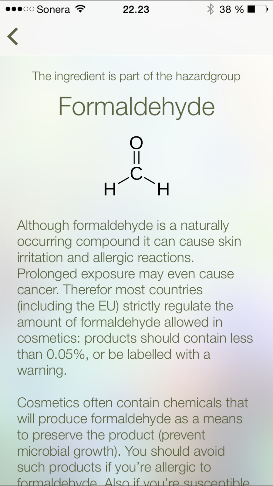 Totta on, että formaldehydin vapauttajat ovat yksi allergisoivimmista säilöntäaineista, sehän on fakta. Mutta jos koko sovellus näyttäisi perustuvan täysin siihen, että kuluttajia varoitellaan vaan näistä parista, kehittäjää itseään mietityttävästä ainesosasta, niin kyllä minusta tuntuu vähän turhalta perustaa henkilökohtaisten mieltymysten pohjalle tällaisella maineella ratsastava sovellus. Eikö nuo myrkkyvaroitukset olisi voinut jättää pois muuten niin hyvästä ideasta?