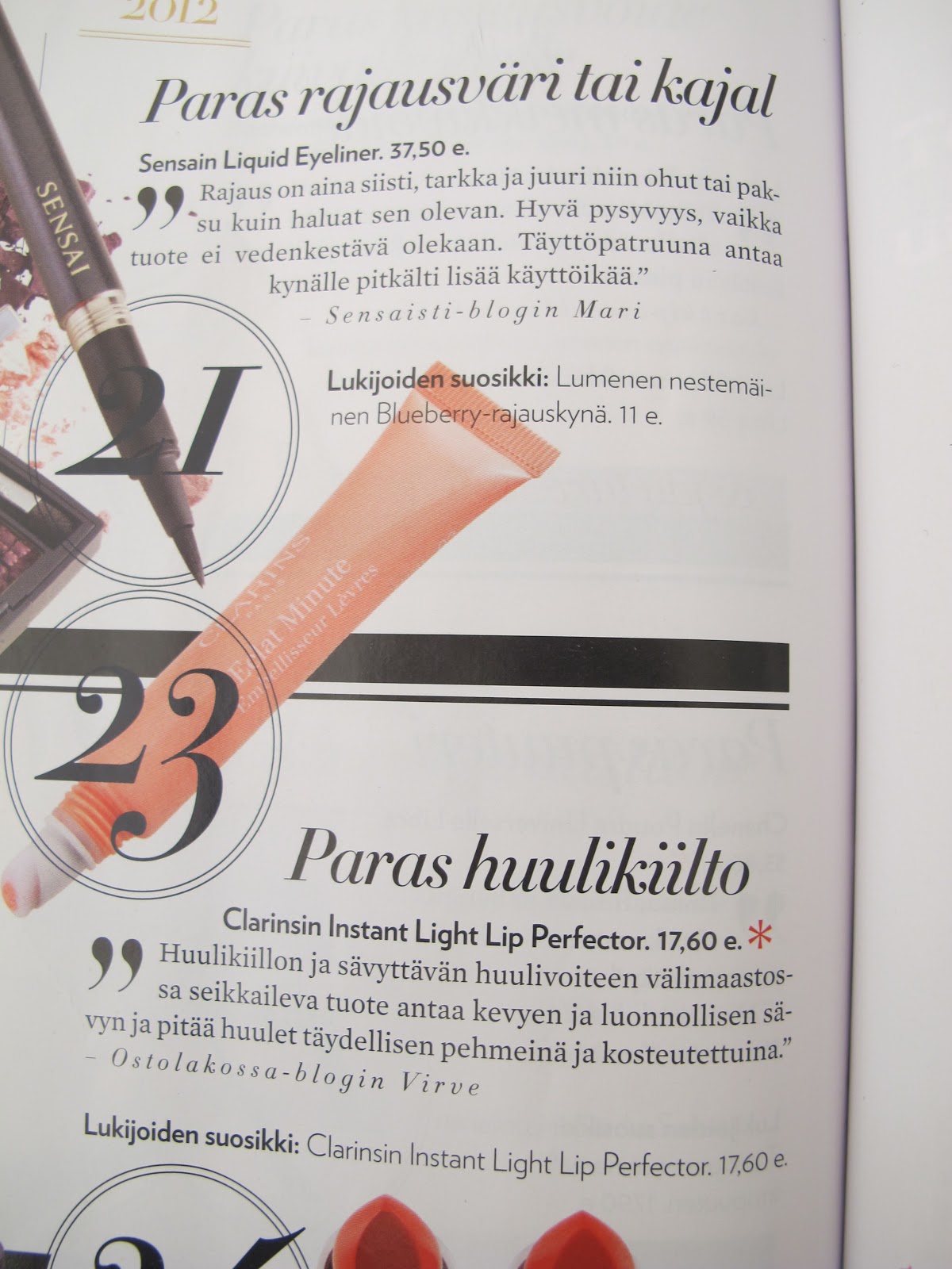 Artikkeli koski vuoden 2012 parhaiksi valittuja kosmetiikkatuotteita.