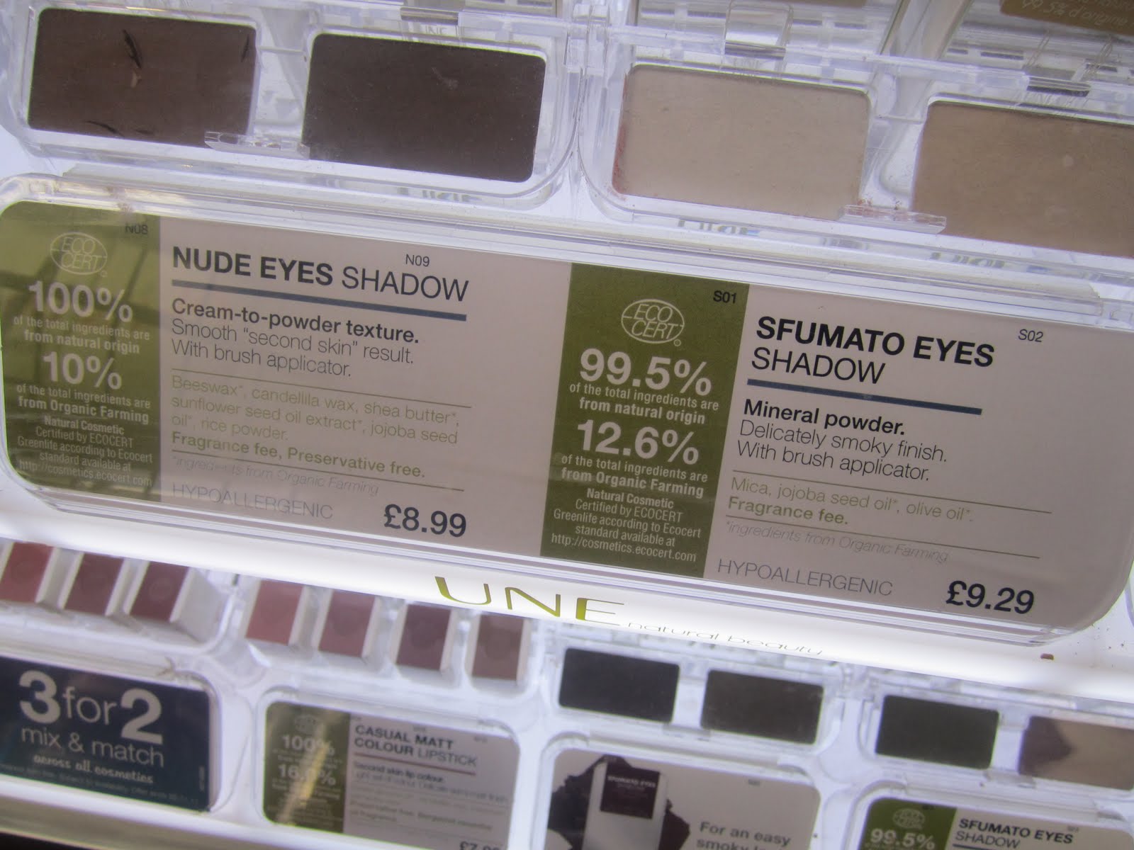 Jokaisen tuotteen yhteydessä on ilmoitettu, kuinka paljon se sisältää luonnosta peräisin olevia raaka-aineita ja kuinka suuri osa niistä on orgaanisesti viljeltyjä. Tuotteet ovat keskihintaisia ja valikoimakin on ihan hyvä.