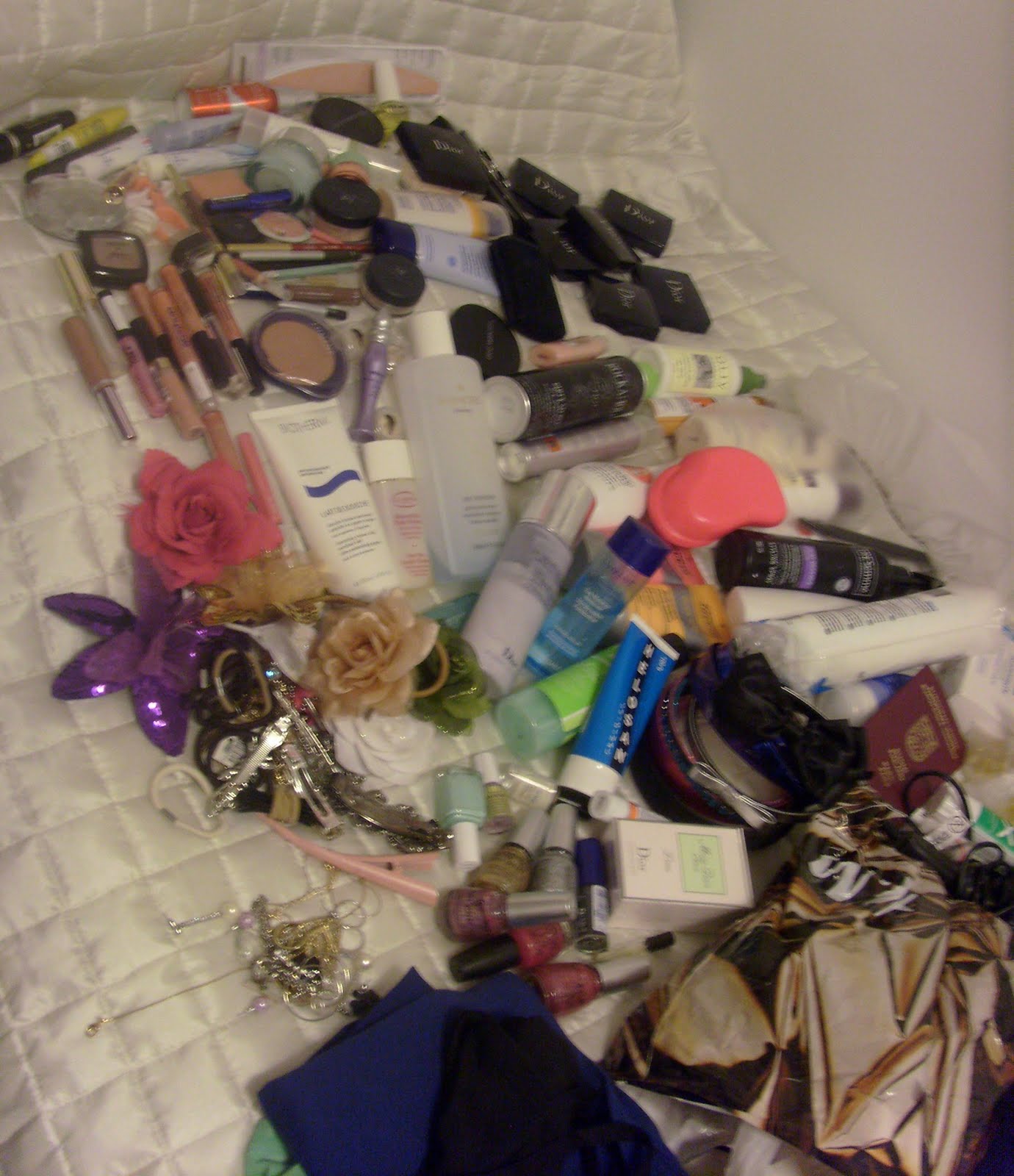 Puolet laukun tilasta veivät vaatteet ja muut käytännöntavarat, mutta toisen puolen lähes kokonaan kauneudenhoitoon liittyvät härpäkkeet. Luoja, kuinka kiitänkään juuri nyt sitä, etten ole ammattimeikkaaja, joka lähtee työmatkalle. Kuolisin, jos raahaisin myös muita varten toista samanlaista tuotearsenaalia!