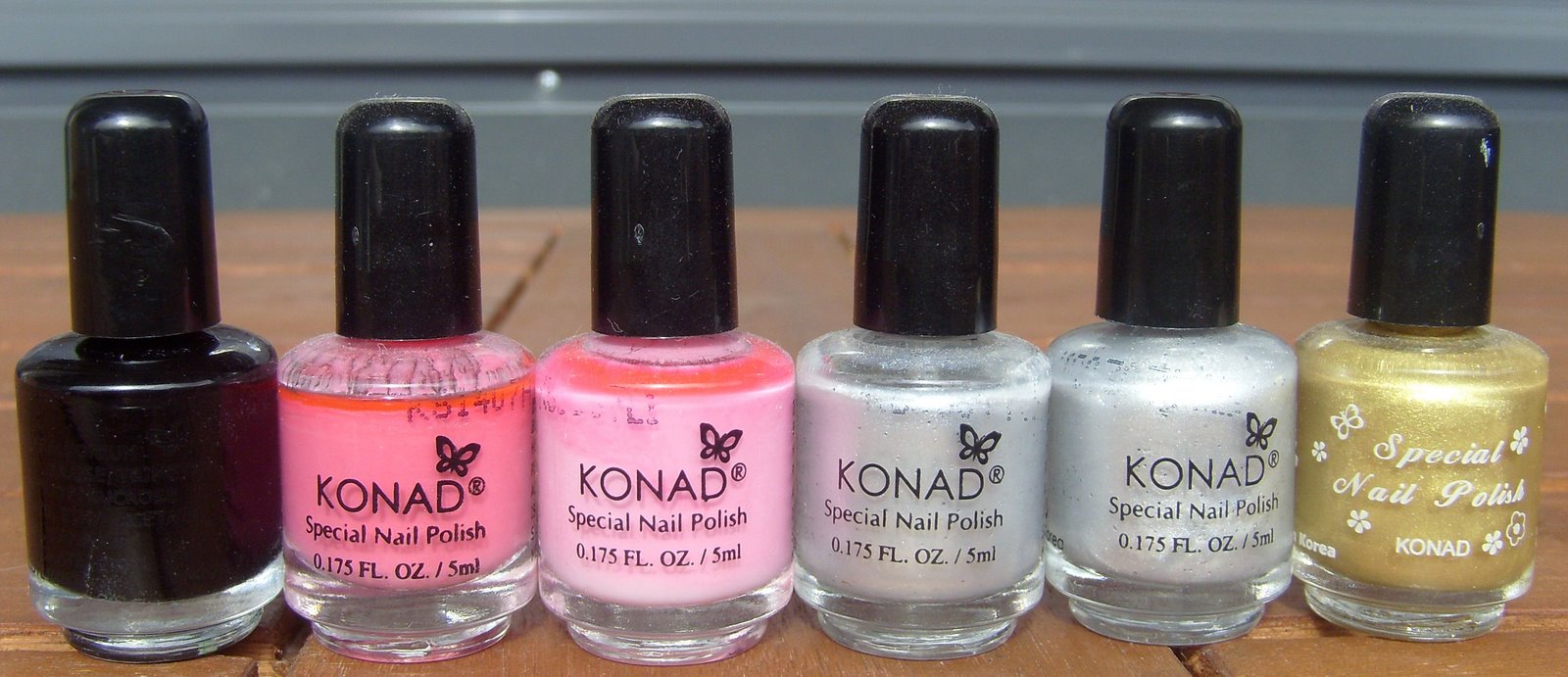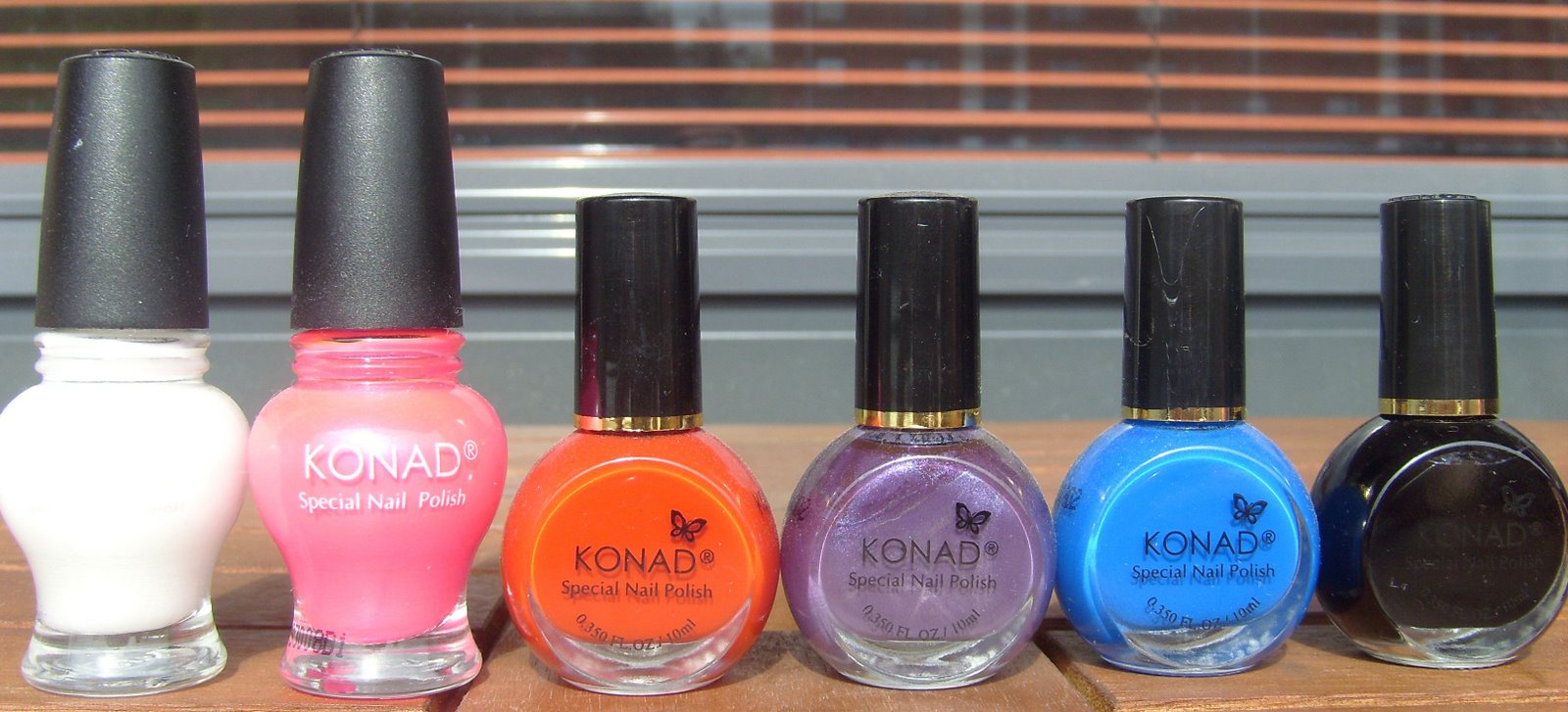 Konad koristelulakkoja. Ensimmäinen ja viimeinen ovat kuvassa oikean värisiä, mutta valkoisen jälkeen tulee ihan kikas pinkki, sitten puhdas punainen, tumma violetti ja tumma kirkas sininen.