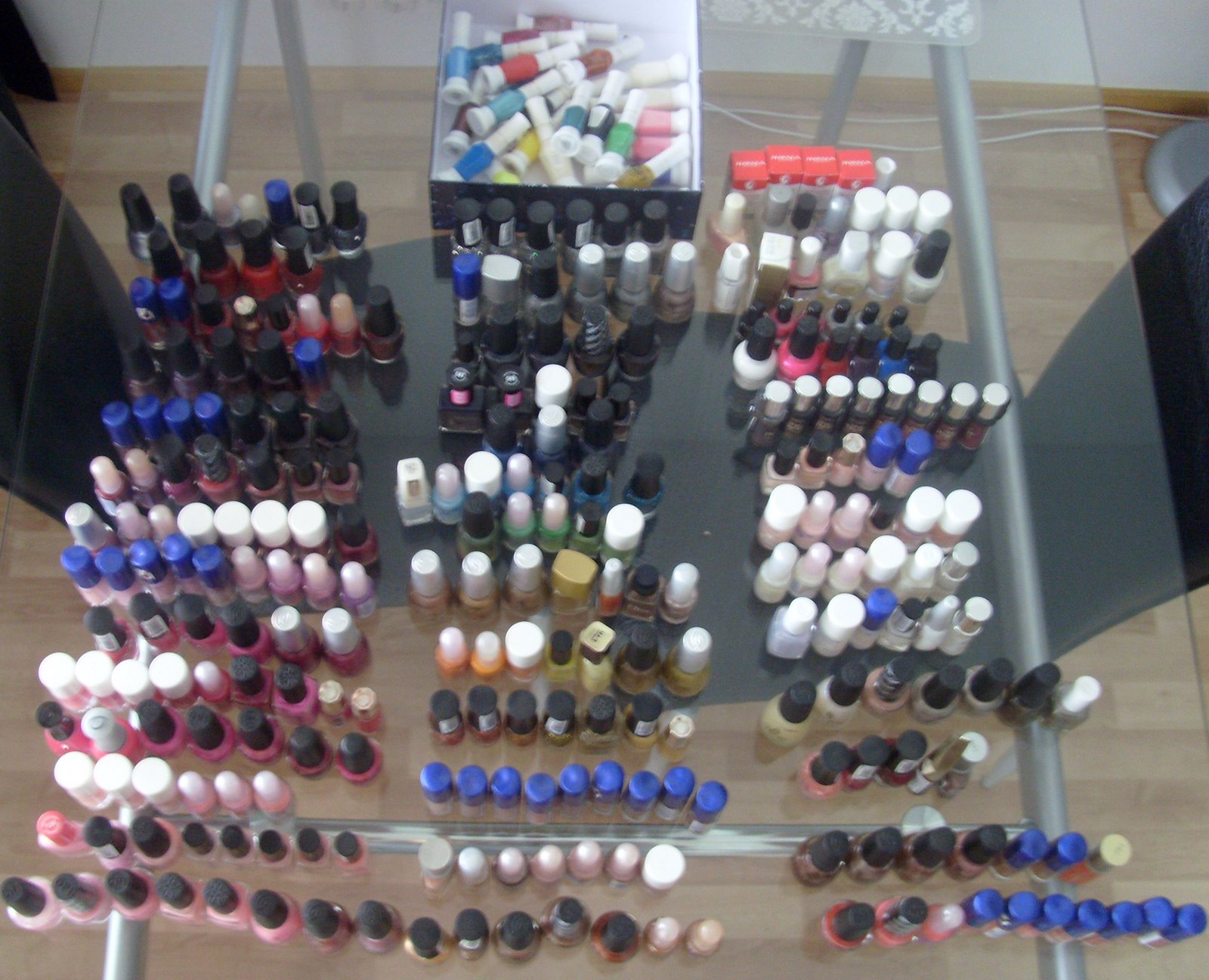 Ja teille, jotka asiaa kuitenkin mietitte: 296. Ja kyllä, tiedän, että minun pitäisi vähentää näiden määrää, mutta katsotaan nyt. Olen nimittäin toisaalta miettinyt, että koska kynsilakat pysyvät hyvinä ainakin sen kymmenen vuotta, niin miksi en voisi suhtautua niihin kuin vaatteisiin? Miksi niistä pitää välttämättä ajatella, että niiden on kuluttava loppuun? Enkö voi vaan pitää niitä, käyttää mitä milloinkin huvittaa ja mikä sopii tilaisuuteen ja hankkiutua niistä vaan eroon sitten, kun en niistä enää välitä tai ovat menneet käyttökelvottomiksi? Niinhän vaatteisiinkin suhtaudutaan.