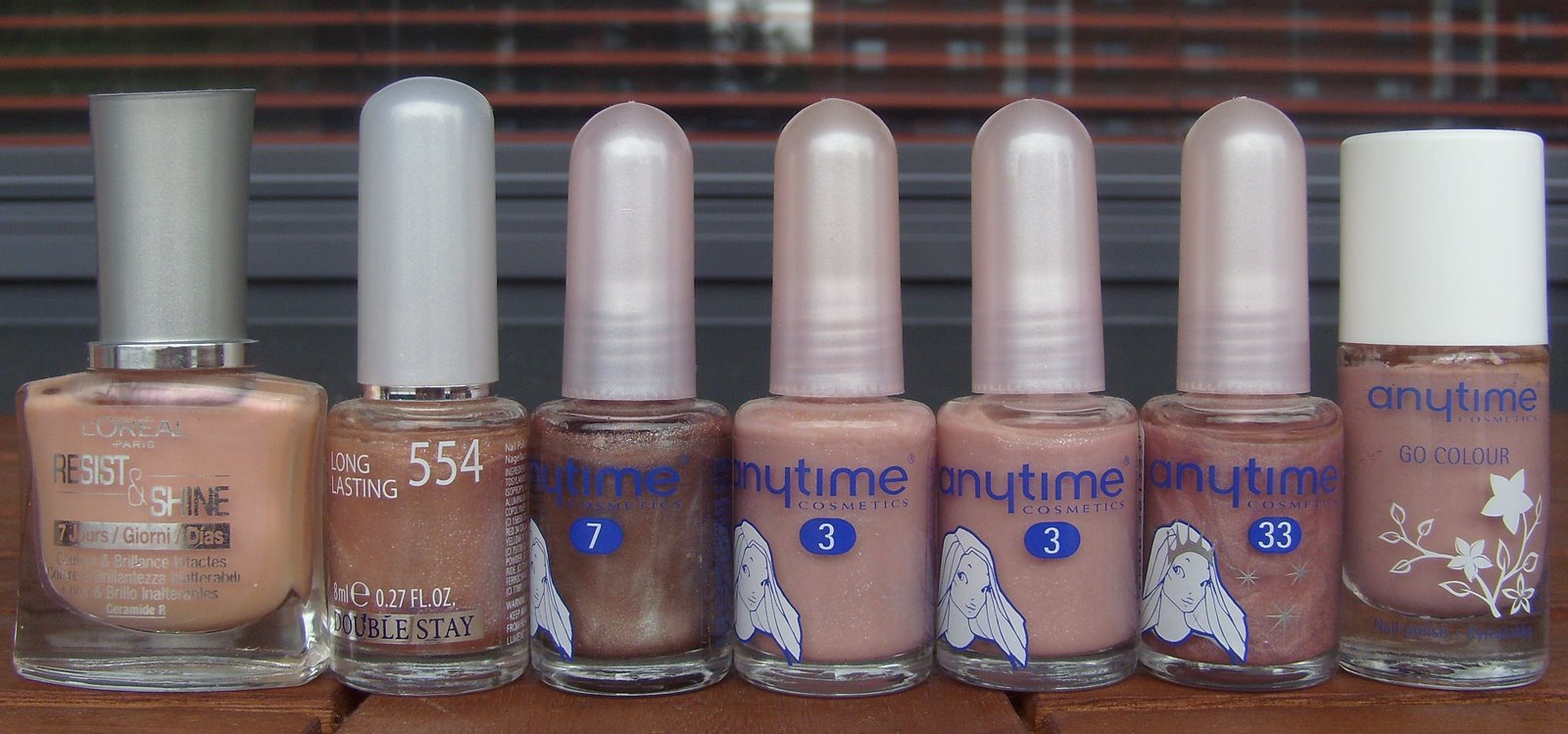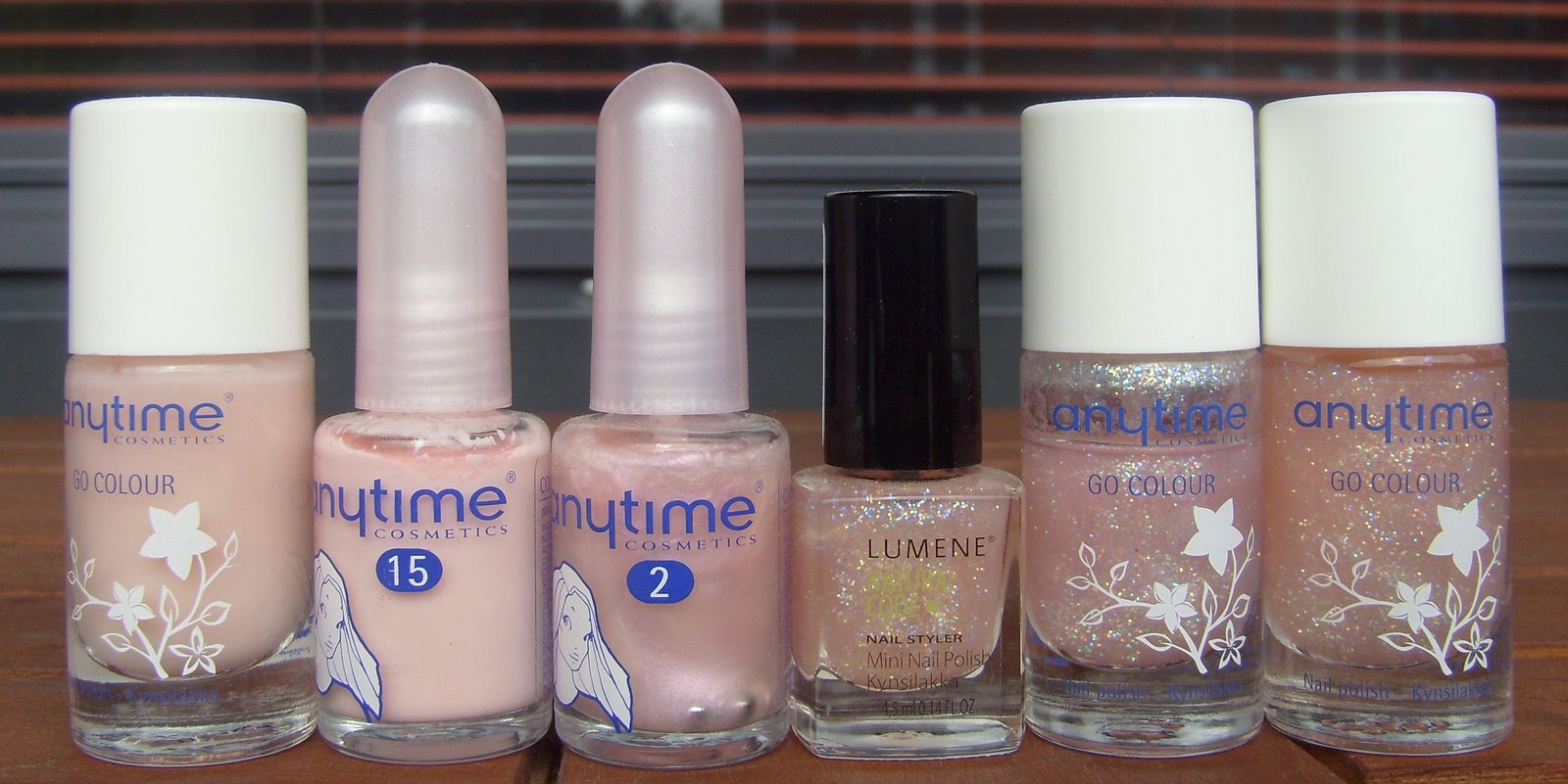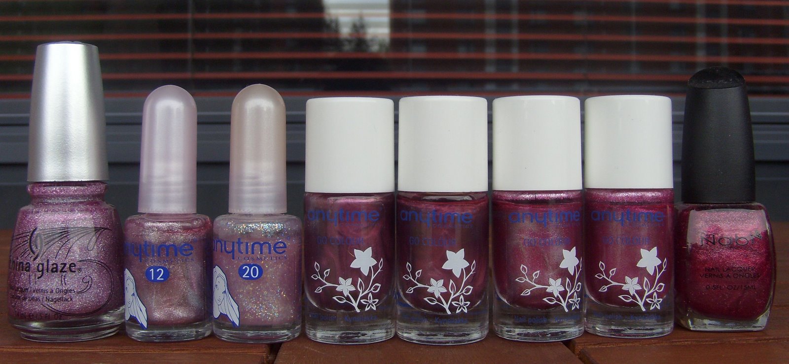 Anytime Balettitanssija, Anytime Ruusunpuna, Anytime Pinkin Himo x 2, Anytime Treffit, Color Club Diva Driver, Color Club Pink Flame, Oma sekoitus (Mavala Adelaide + Riga) ja Mavala Adelaide.