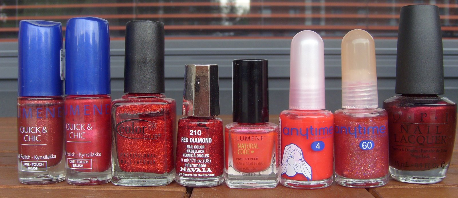 Lumene Pieni Yösoitto, Lumene Levoton Sydän, Color Club Art Of Seduction, Mavala Red Diamond, Natural Code Stand Out, Anytime Lempi, Anytime Rubiini ja OPI Pretty At The Premiere.