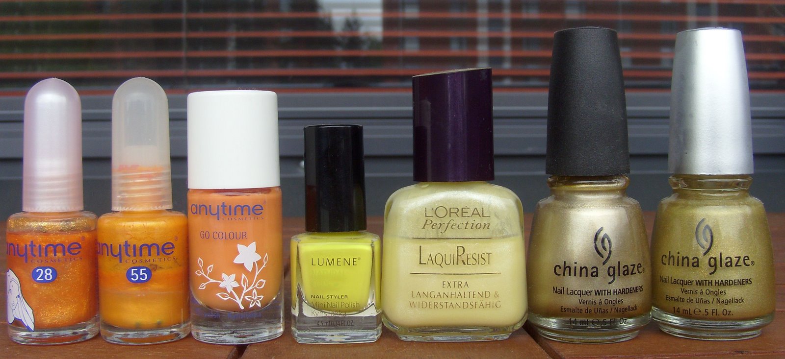 Anytime Auringonnousu, Anytime Mangosorbetti, Anytime Auringonkukka, Natural Code Get Color, L’oreal Banana Shake, China Glaze Passion ja China Glaze GR8.