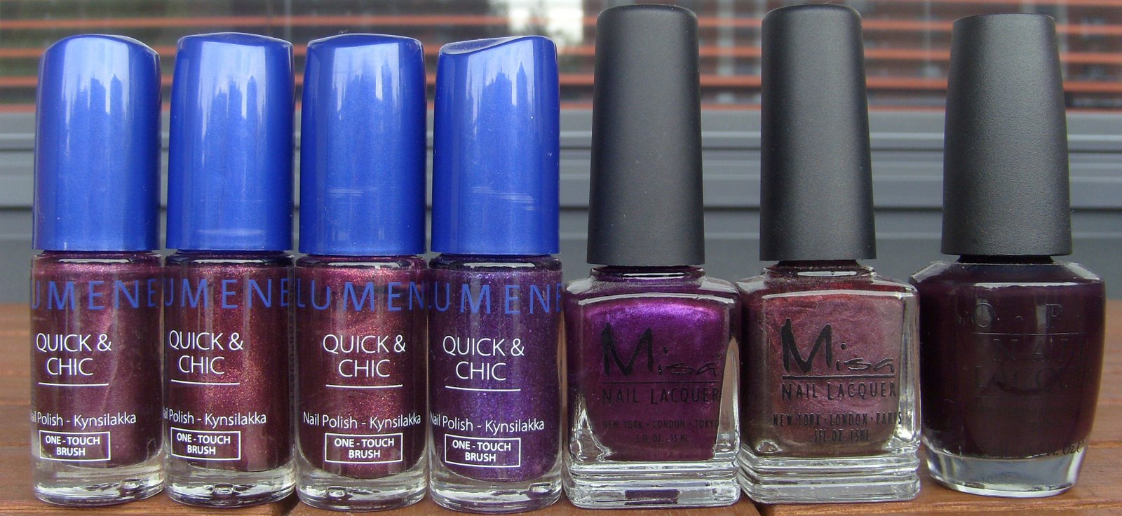 China Glaze Delight, China Glaze Magical, China Glaze Poetic, China Glaze Down Under Dusk, Lumene Viimeinen Kesä x 2 ja L’oreal 753.
