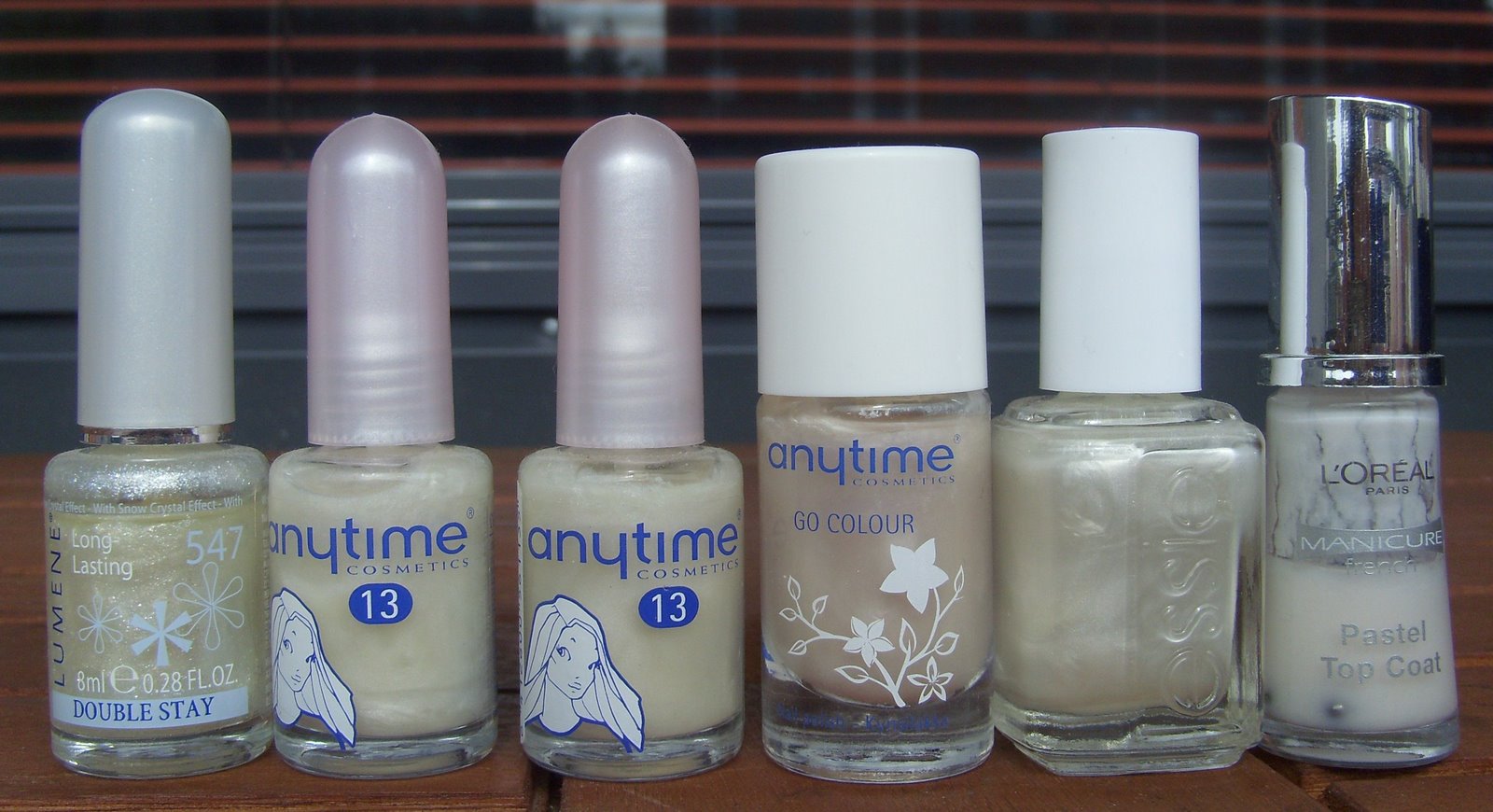 Lumene Timantteja Hangella, Anytime Kohtaaminen x 2, Anytime Hopeaharja, Essie Pearly White ja L’oreal Pastel Top Coat.