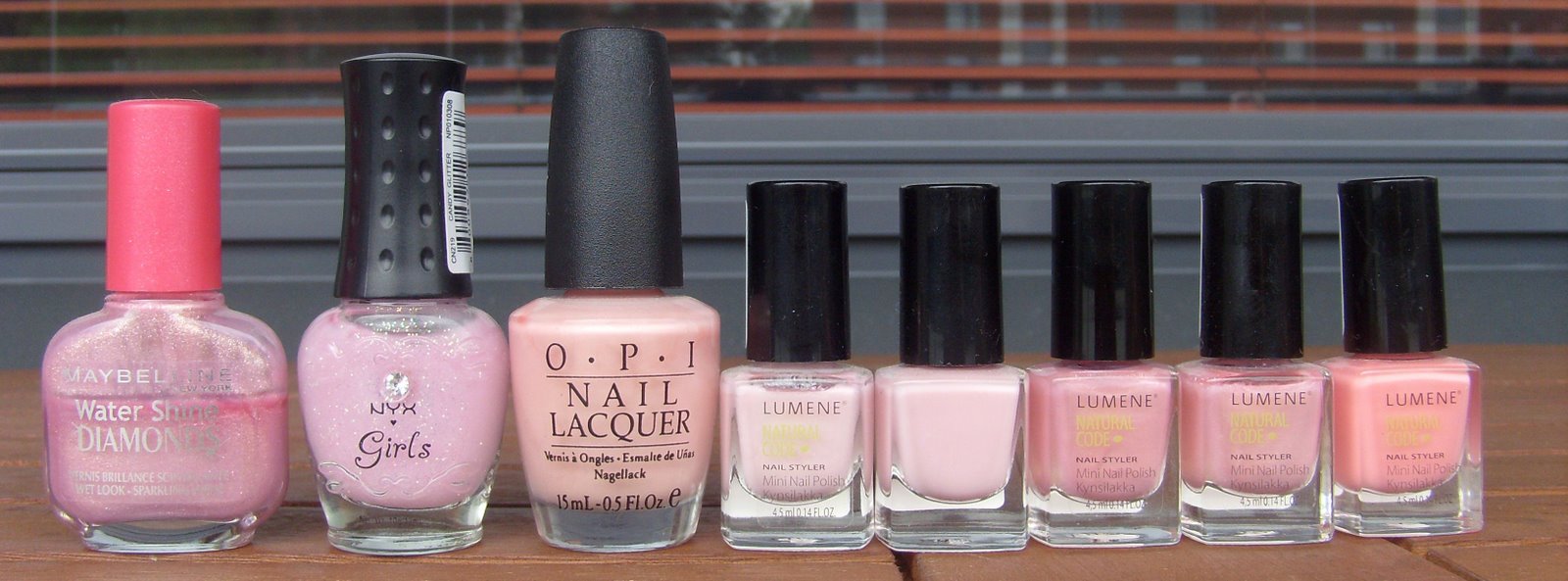 Maybelline Precious Pink, NYX Girl Candy Glitter, OPI Italian Love Affair, Natural Code Stay Pretty, Natural Code Feel Good, Natural Code Be Fabulous x2 ja Natural Code Be Cool.