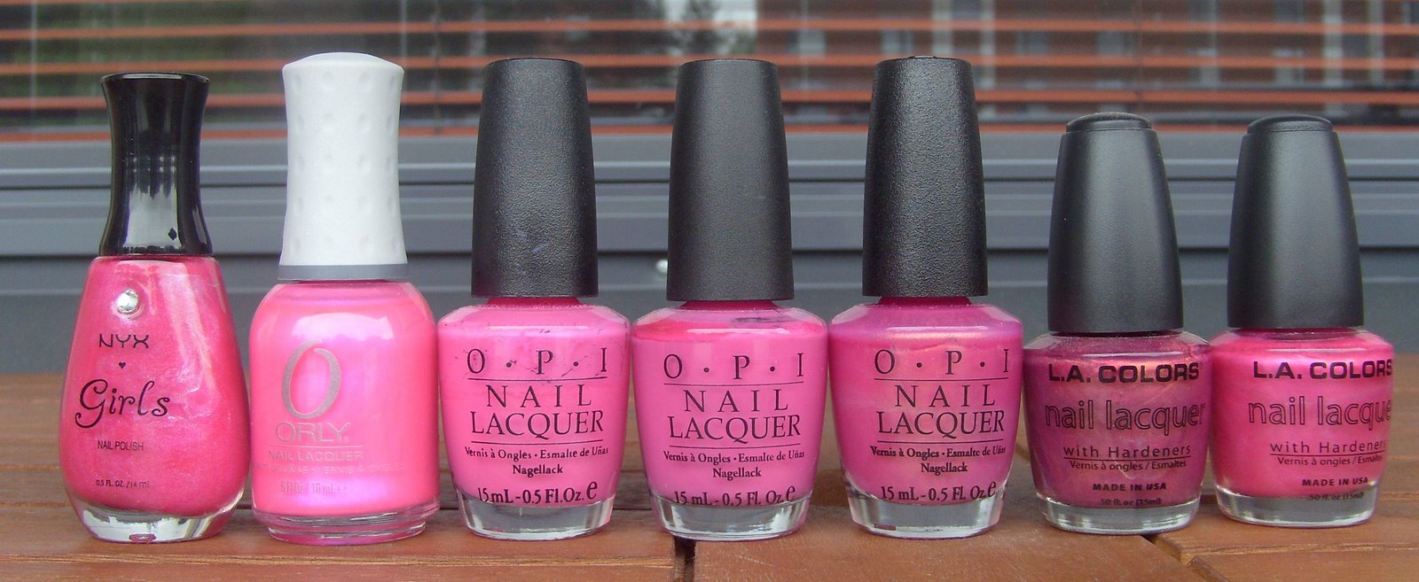 Nyx Girls Margarita, Orly Oh Cabana Boy, OPI La Paz-itively Hot, OPI I’, Indi-a Mood For Love, OPI Señorita Rose-alita, L.A. Colors Pink Sizzle ja L.A. Colors Flashy Fuchsia.
