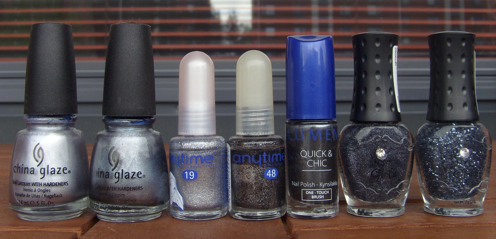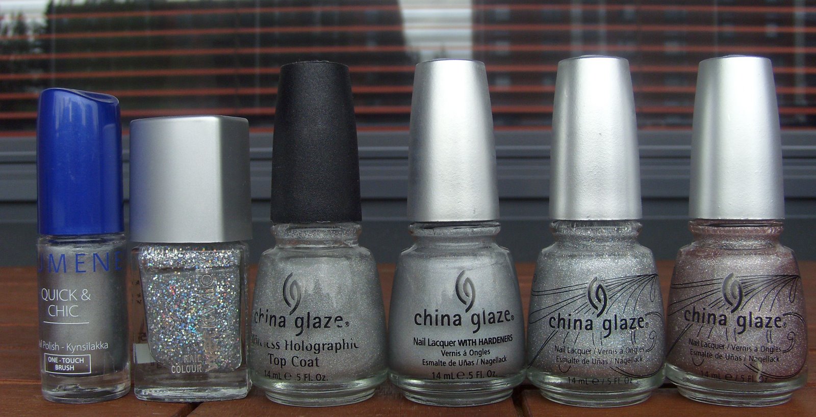 Lumene Hopeakuu, Wet ’n Wild 25, China Glaze Wireless Holographic Top Coat, China Glaze OMG, China Glaze Sexagon ja China Glaze Visit Me In Prism.