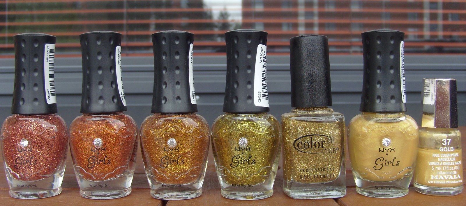 NYX Girls CN242, NYX Girls CN248, NYX Girls CN236, NYX Girls CN225, Color Club Sultry (Diva), NYX Girls Marigold ja Mavala Gold.