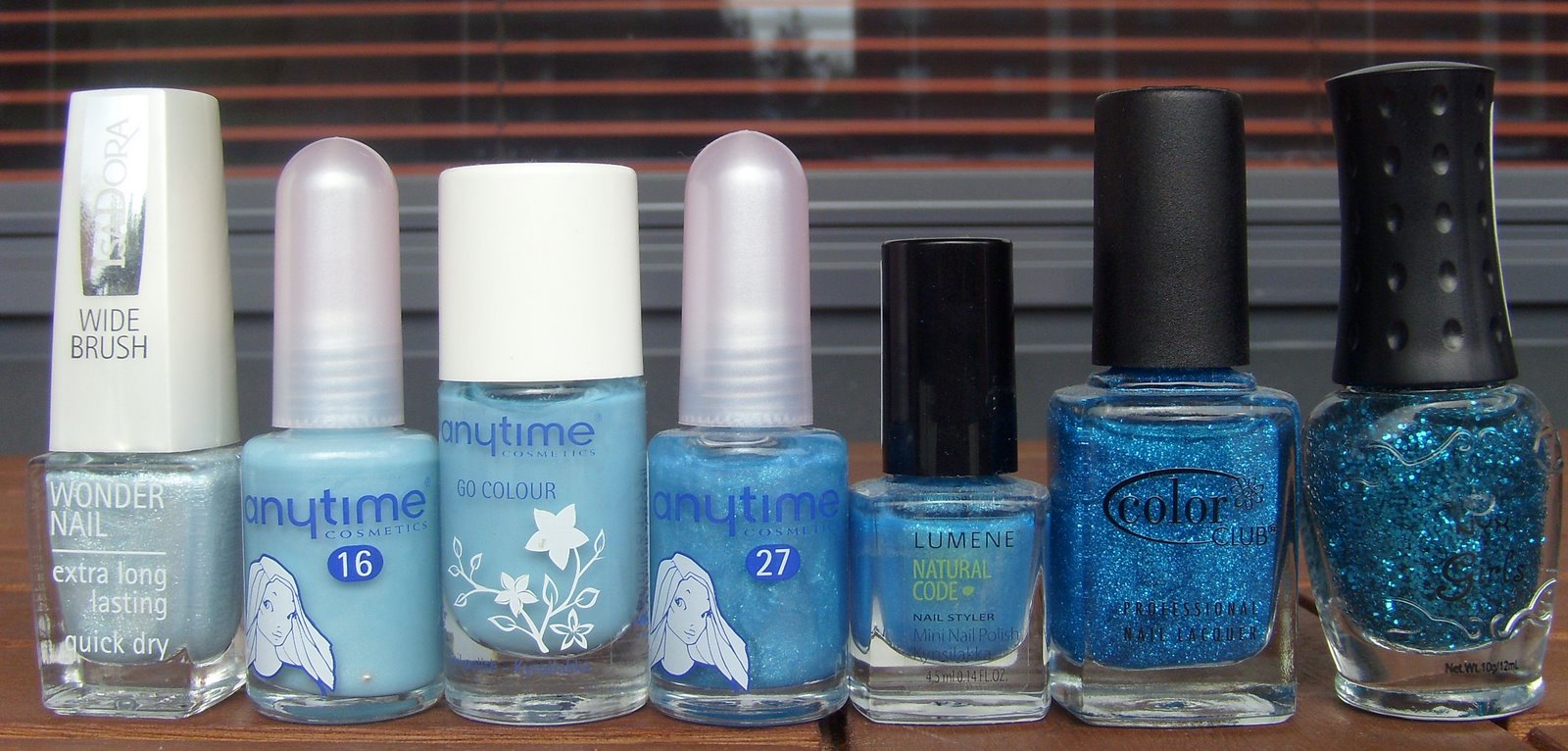 IsaDora Diamond Blue, Anytime Soitto, Anytime Taikameri, Anytime Sininen Laguuni, Natural Code Live It Up, Color Club Sexy Siren ja NYX Girls CN231.